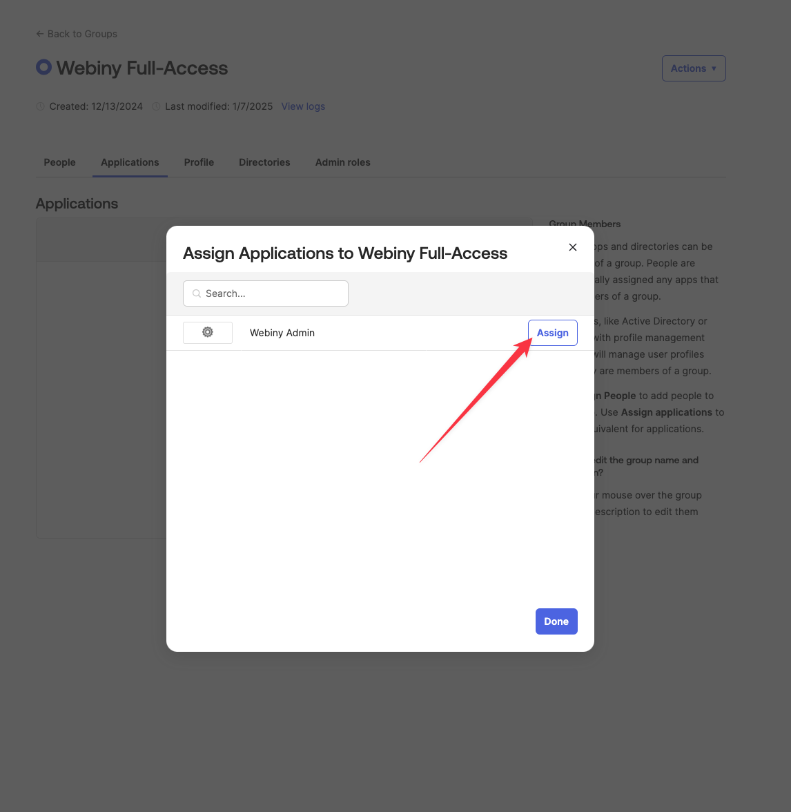 Once you have the app integration in place, you need to set up a connection between Okta users, and Webiny roles. In this example, we’ll be assigning users to Okta groups, and by doing that we want those users to automatically have certain application rights within Webiny.